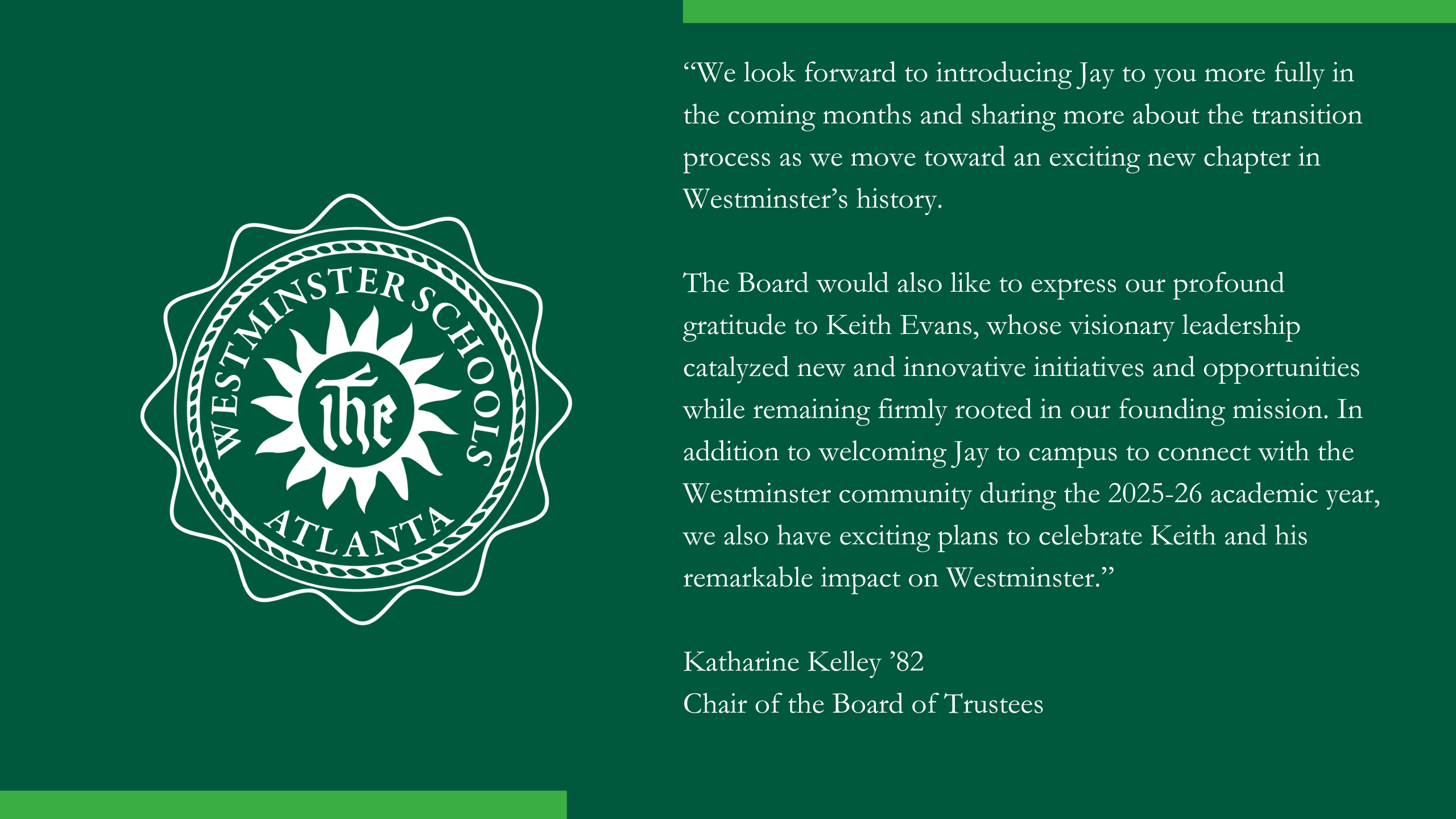 As we look to the future, we are confident that Jay’s leadership will inspire our community and continue to strengthen our commitment to Westminster’s mission. We also know our entire community will welcome Jay and his family with the hospitality and spirit that define our school.